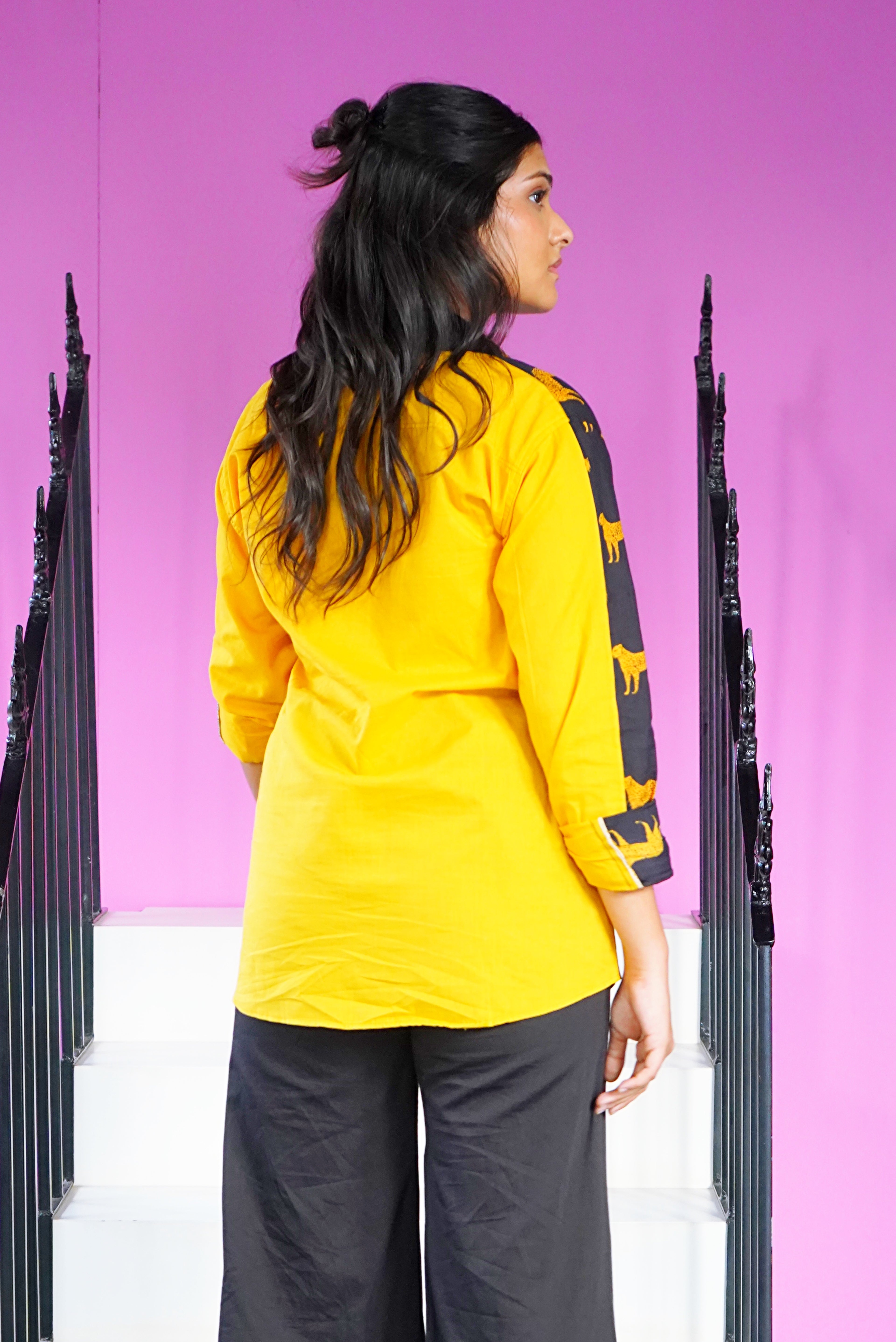 - Features plain yellow complementing fabric on the back and detailing on pockets for a pop of color