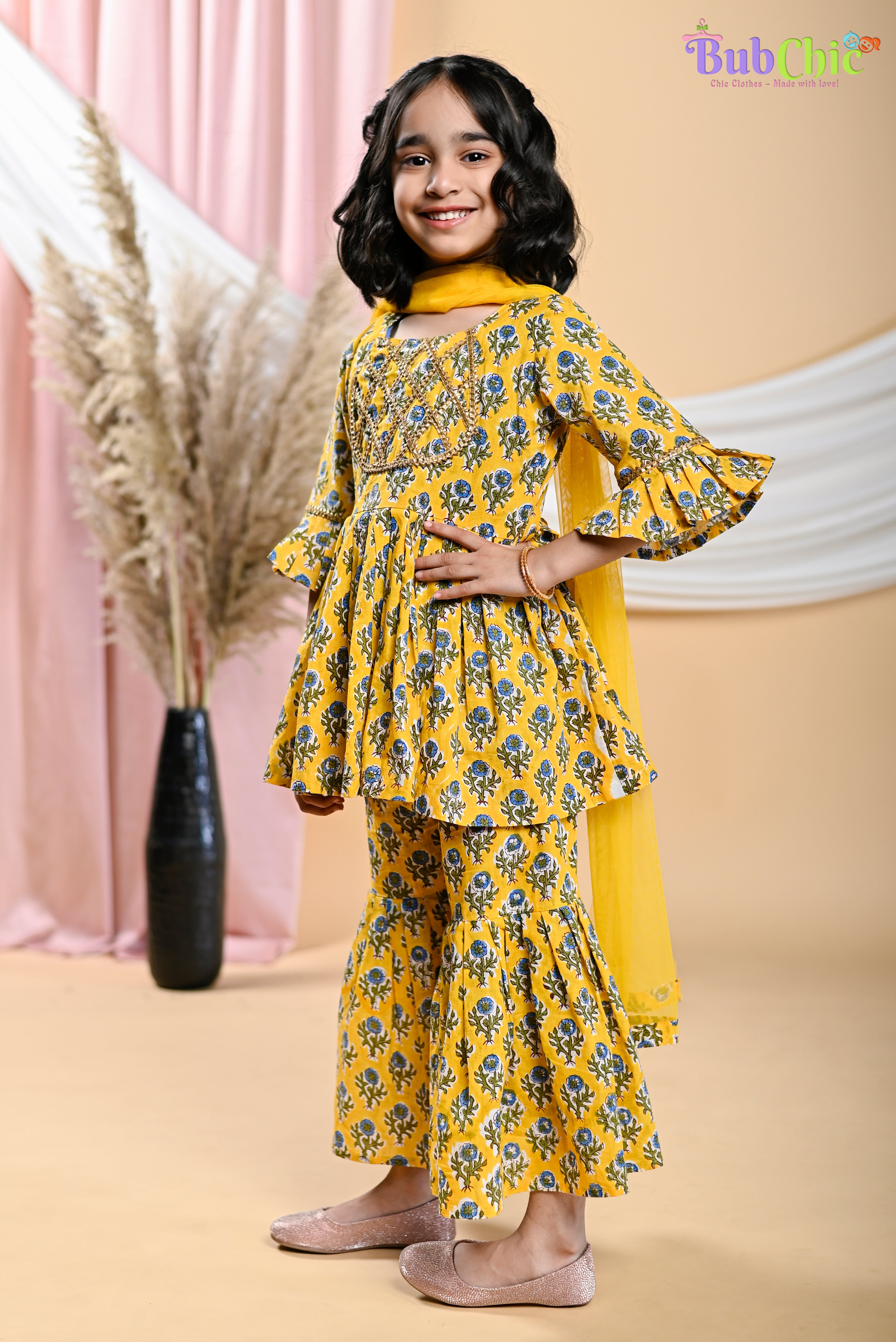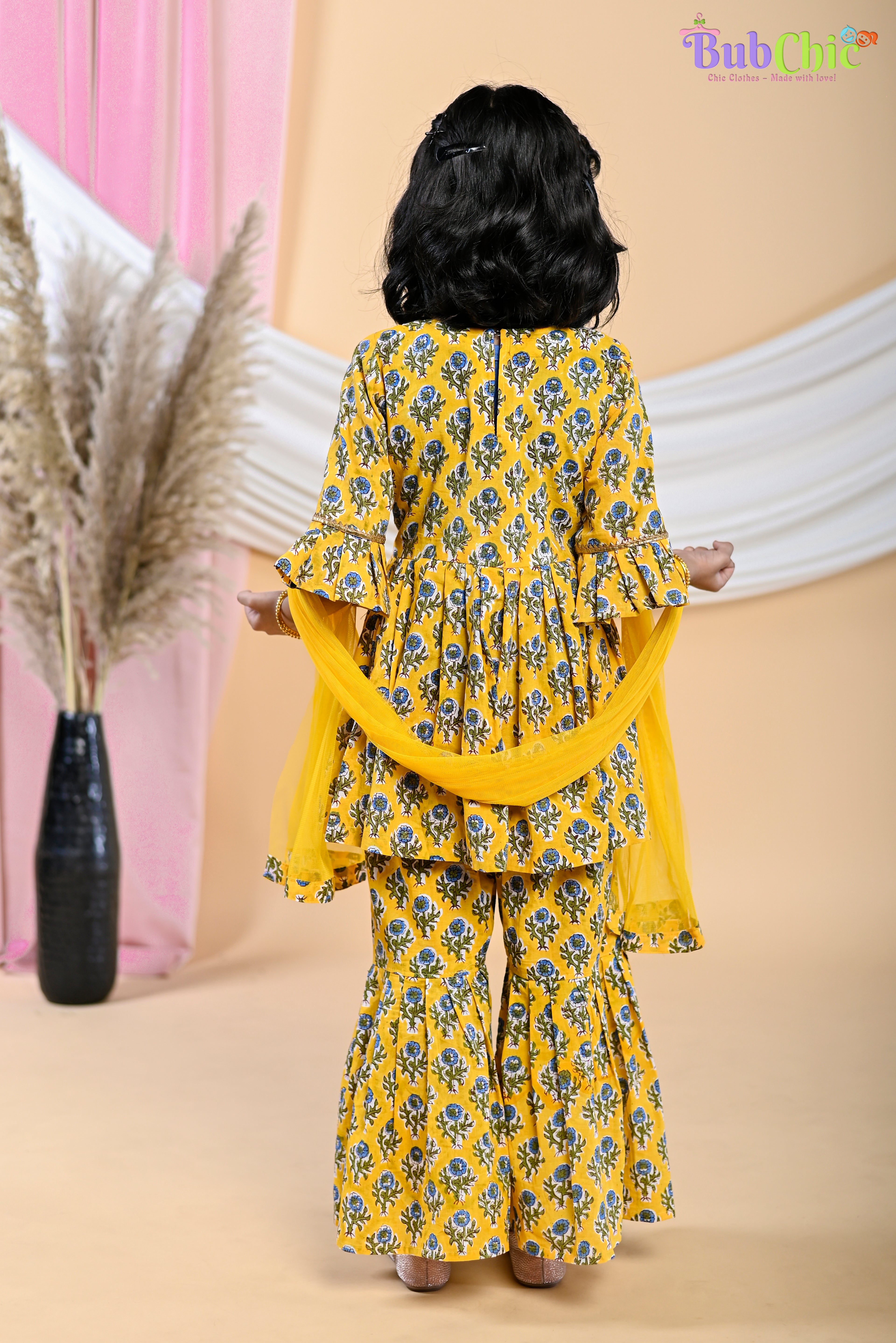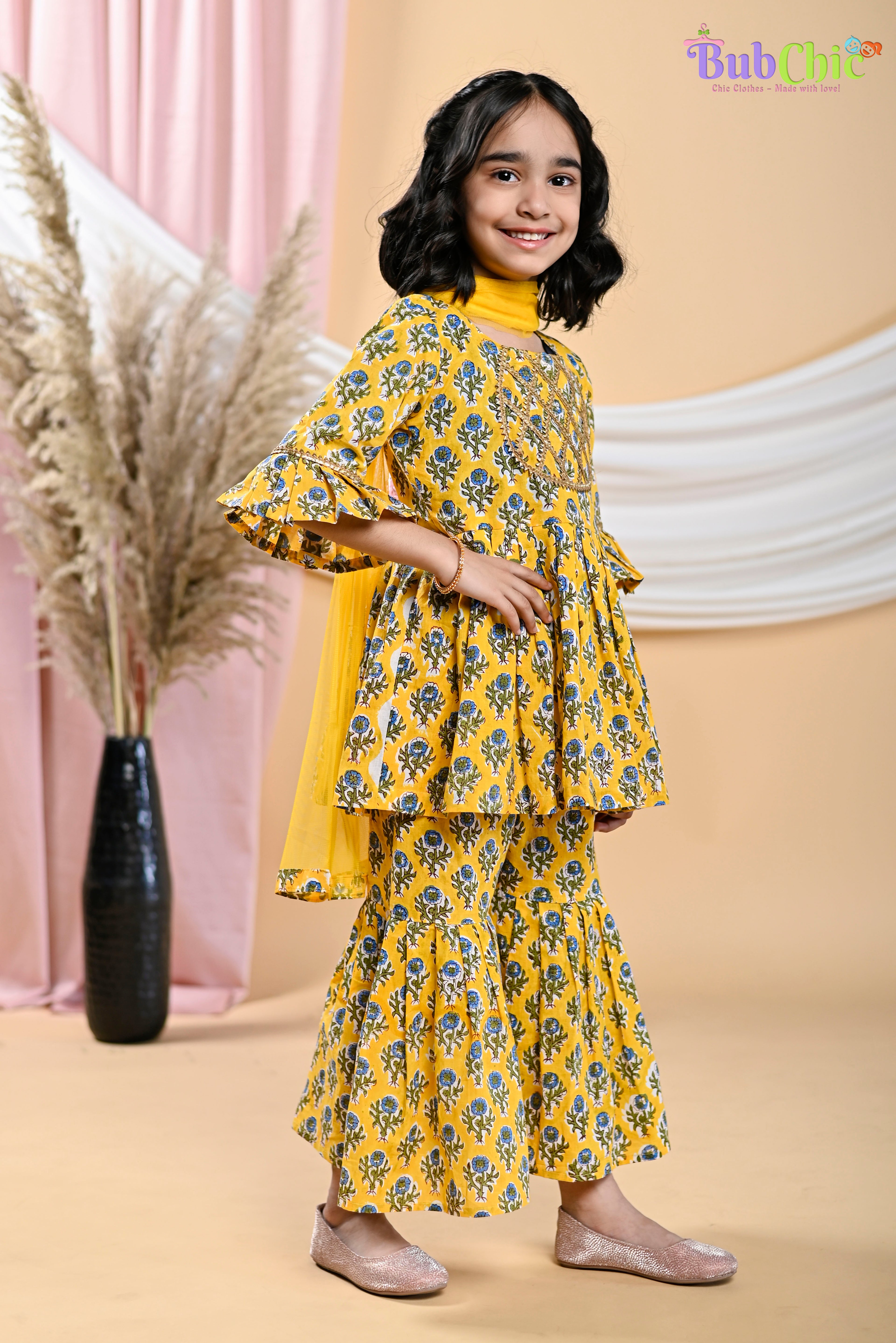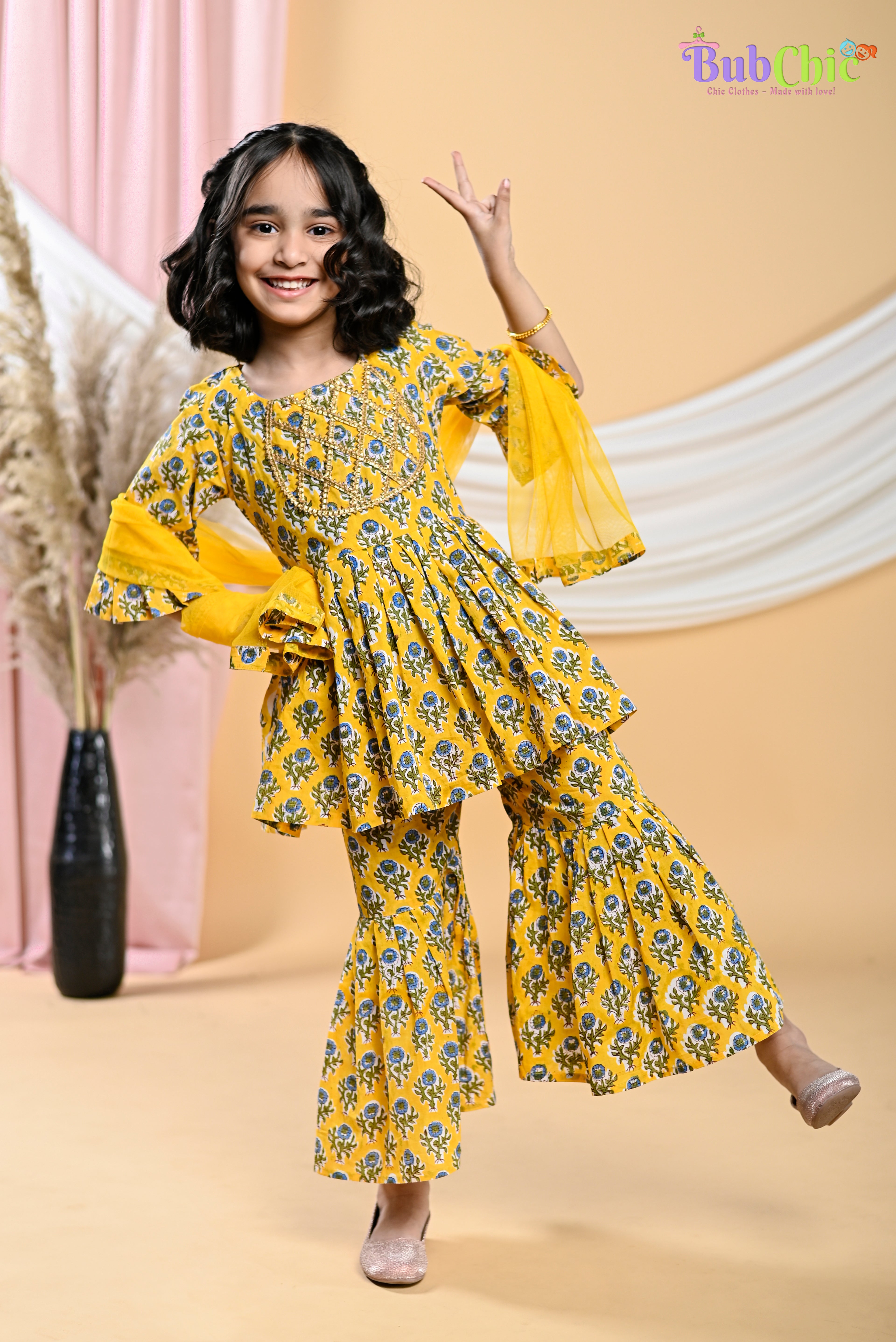Put a fun spin on your traditional wardrobe with this Yellow booti printed kurta and sharara with a dupatta. Comfort and style collide with this sibling set. Make a statement in the traditional attire without compromising on comfort with its pure cotton fabric. Get spotted in the crowd and be known for your stylish flair! This eye-catching Yellow booti printed dress set is sure to spruce up your wardrobe in no time.